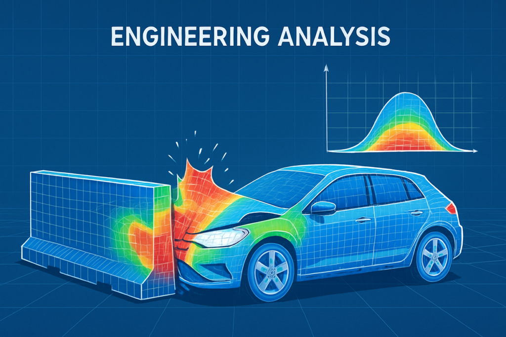 Crash simulations: Digital crash tests simulate frontal, side, and rear impacts to verify passenger protection.